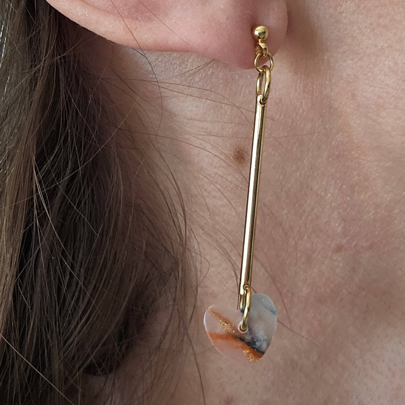 Pendientes artesanales únicos, hechos a mano con conectores alargados de latón que ofrecen un toque de elegancia y muy especial. Cada par está acabado con un pequeño corazón de arcilla polimérica translúcida tintado a mano y cubierto de resina para darle un elegante brillo.