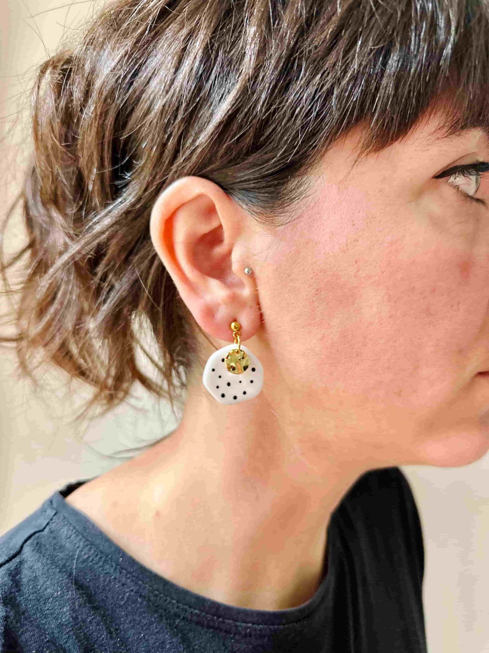Preciosos y originales, estos pendientes artesanales hechos a mano con arcilla polimérica blanca destacan por su diseño asimétrico en forma de círculo, decorado con delicados puntos negros con un ligerísimo relieve que aportan textura y contraste. Como toque final, una hoja de latón dorado colgante añade movimiento, brillo y un aire natural y elegante.