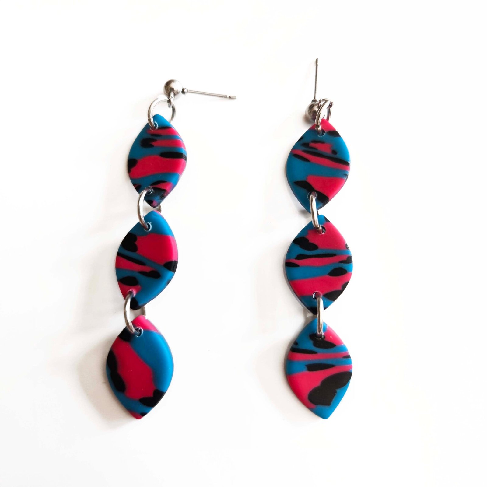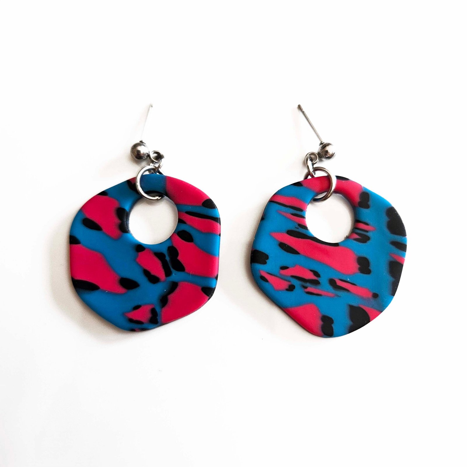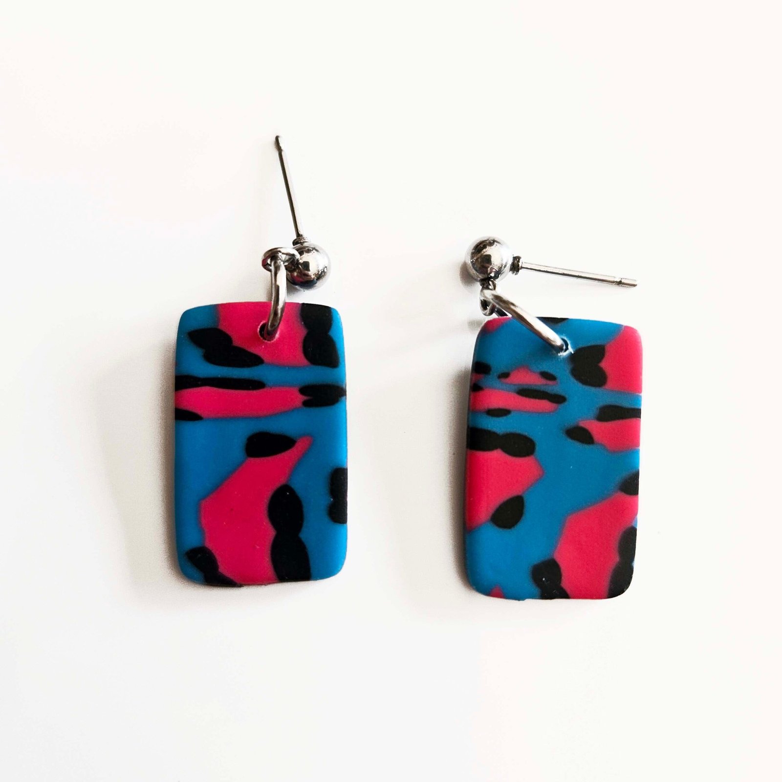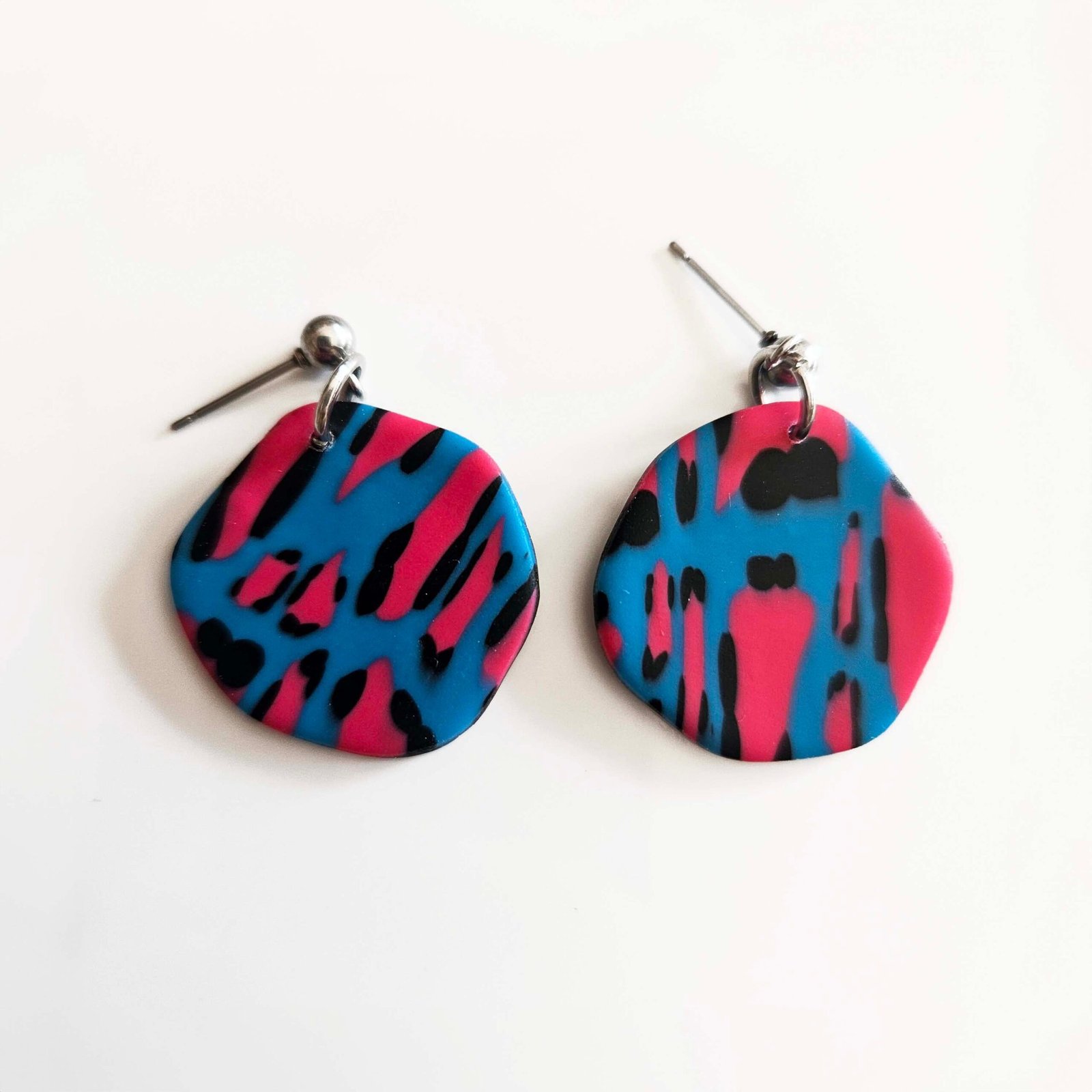 Pendientes artesanales con diseño animal print en tonos azul, rosa y negro. Llamativos, modernos y llenos de personalidad, cada par es único. Ligeros y cómodos, perfectos para dar un toque atrevido y sofisticado a cualquier look.