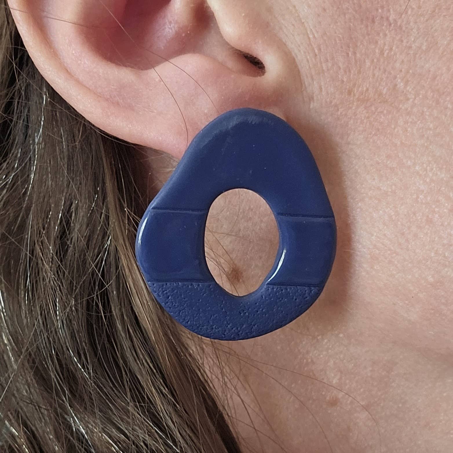 Originales pendientes artesanales con forma asimétrica hechos a mano con arcilla polimérica de color azul. Tienen tres texturas diferentes y el diseño, con un poste de acero inoxidable, los mantiene pegados al lóbulo. Un diseño original y elegante al mismo tiempo.