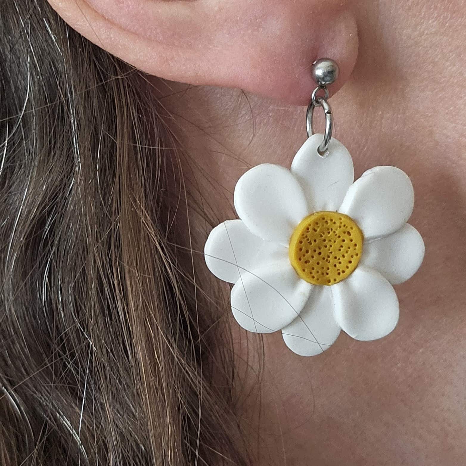 Pendientes de margarita tamaño XL hechos a mano con arcilla polimérica. Los enganches son pernos de acero inoxidable. Unos pendientes muy ligeros que dan mucha luz al rostro.