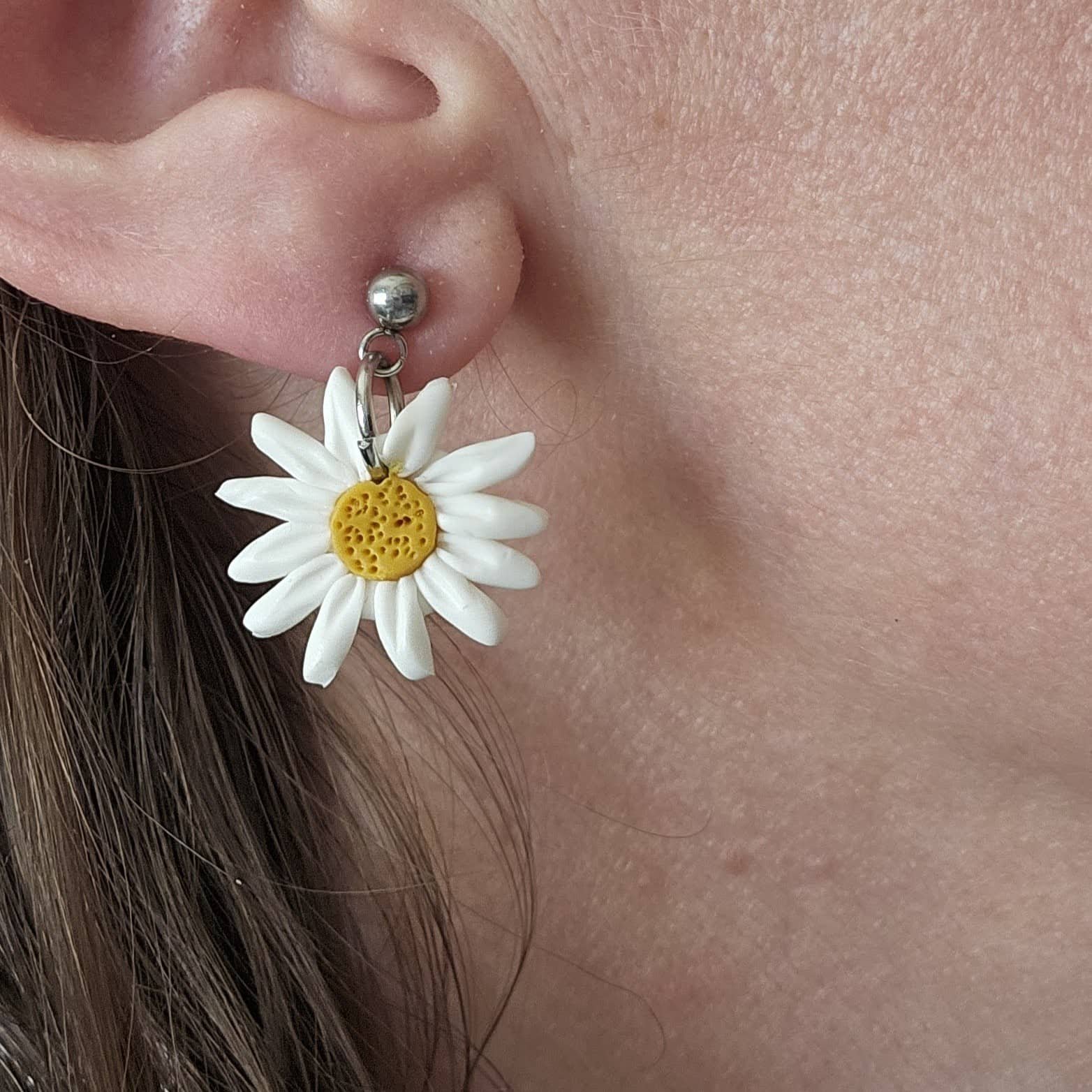 Pequeños y delicados pendientes de margaritas elaborada artesanalmente con arcilla polimérica que cuelgan de pernos de acero inoxidable plateado hipoalergénico. Ideales para complementar cualquier estilismo por su versatilidad, iluminando tu rostro.
