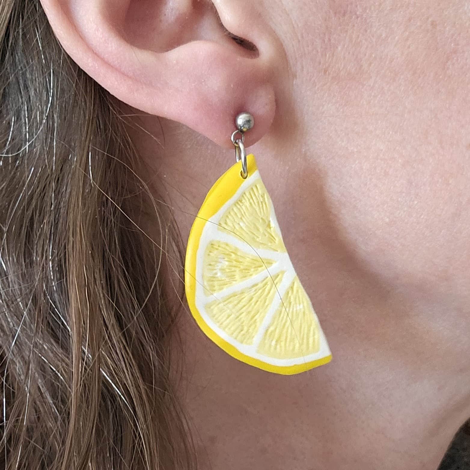 Originales pendientes moldeados a mano uno a mano con arcilla polimérica de color amarilla con forma de media rodaja de un limón. Cada pieza es única. Los enganches son pernos de acero inoxidable hipoalergénicos.