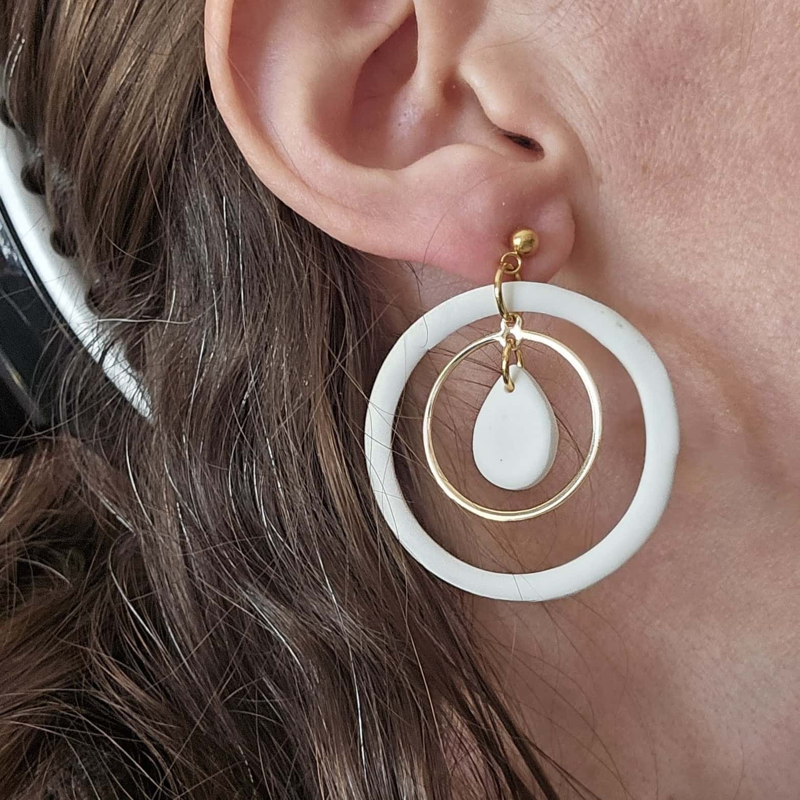 Preciosos pendientes de diseño geométrico elaborados a mano con arcilla polimérica y decorados con un elegante y favorecedor aro de latón dorado. Muy elegantes y ligeros. Los enganches son de acero inoxidable.