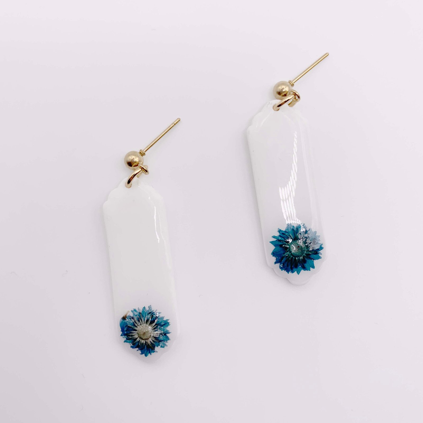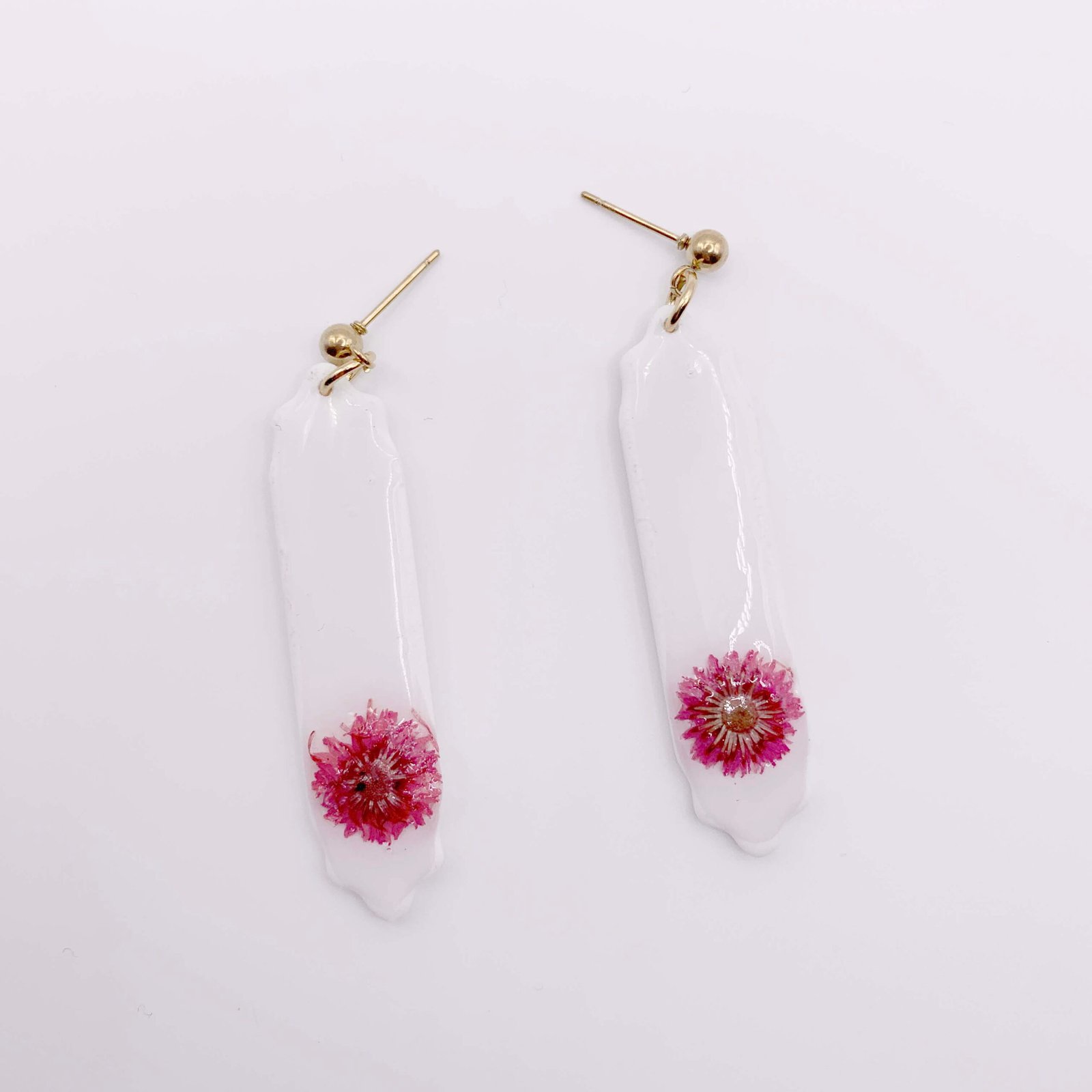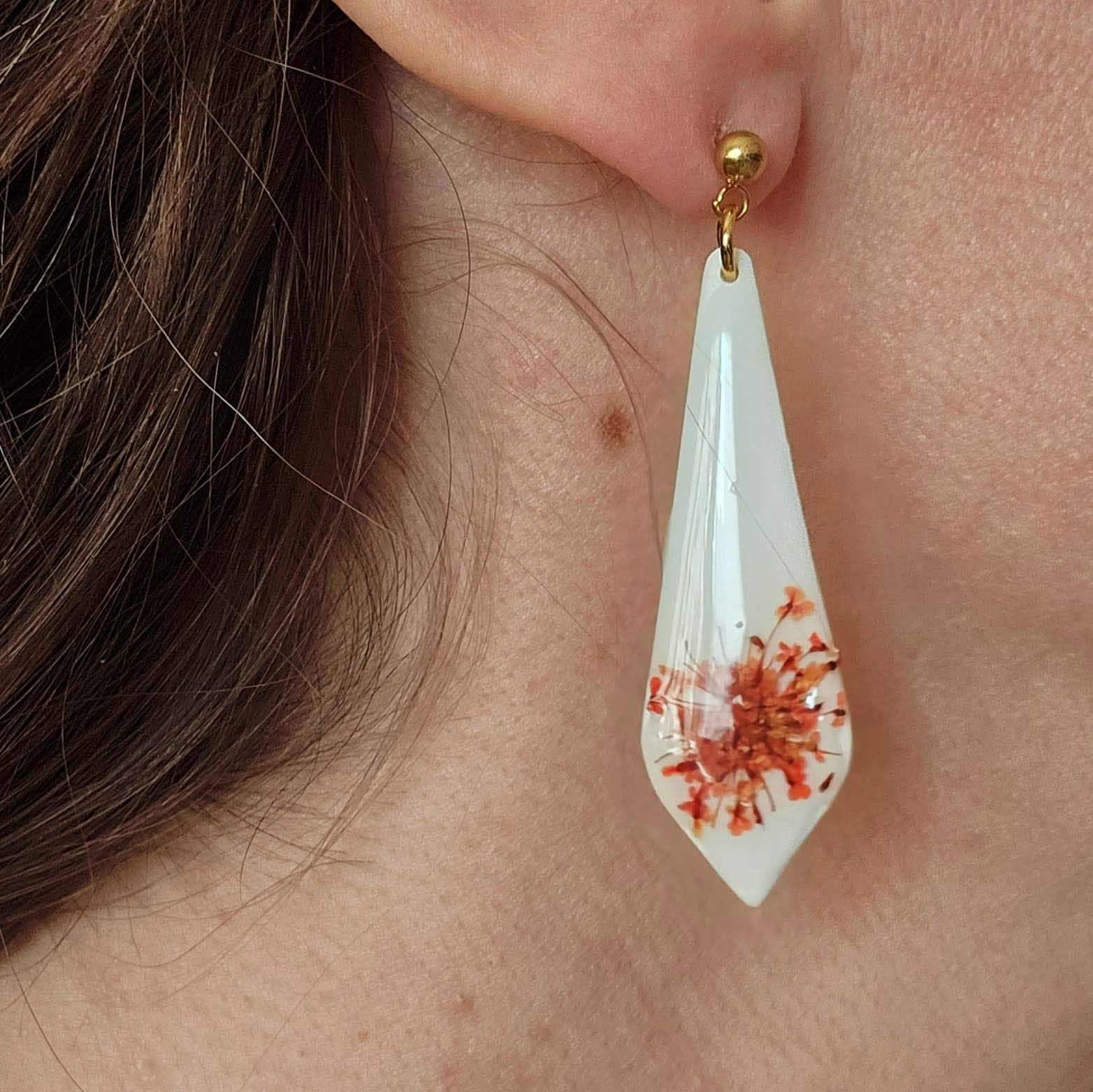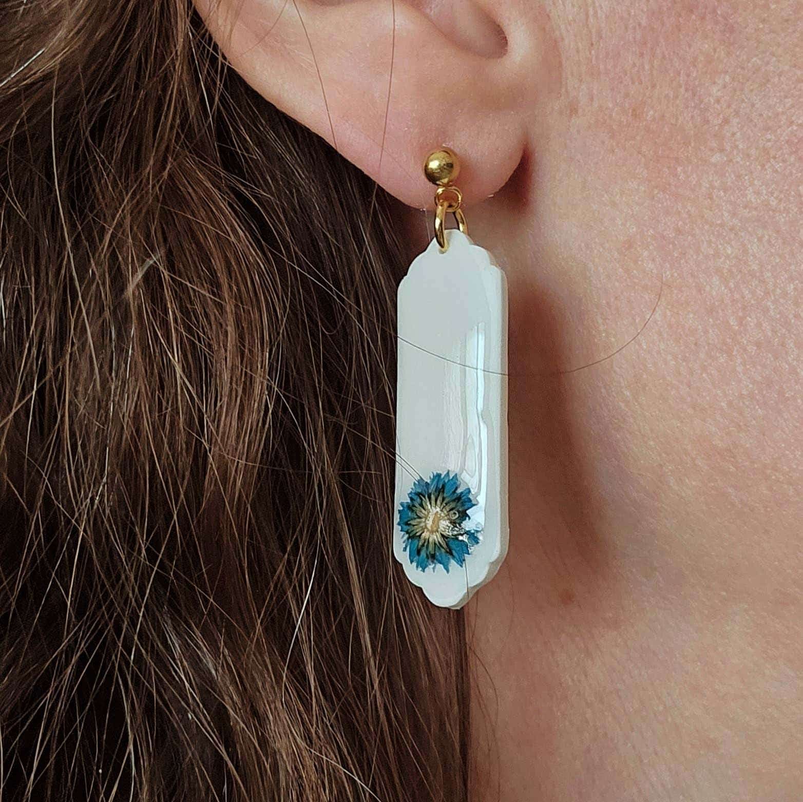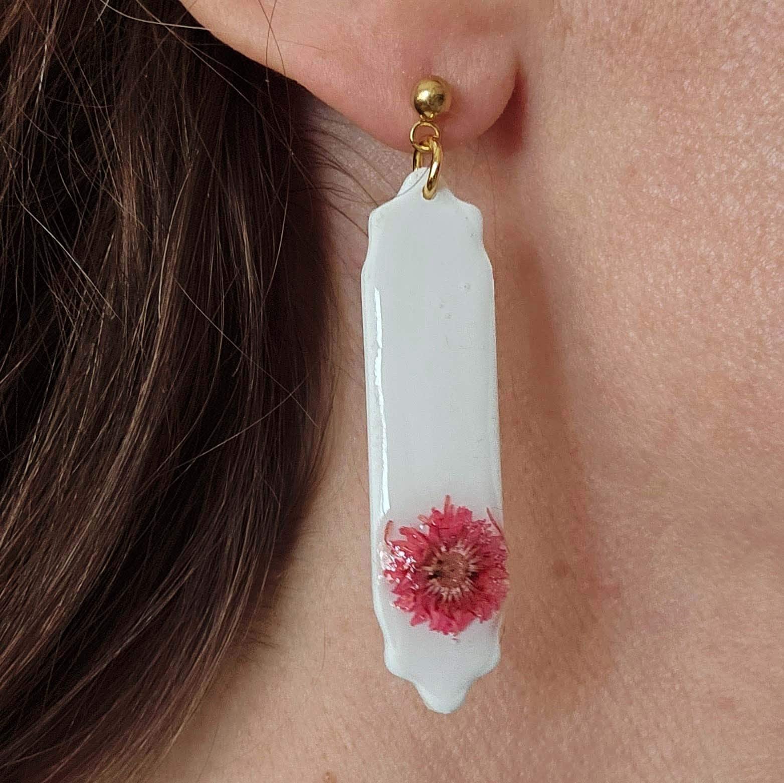 Estos pendientes artesanales de arcilla polimérica en color blanco combinan delicadeza y diseño contemporáneo en una pieza única y elegante. Cada pendiente incorpora una flor seca natural cuidadosamente seleccionada, encapsulada y protegida con una fina capa de resina que aporta brillo, profundidad y mayor durabilidad al diseño.