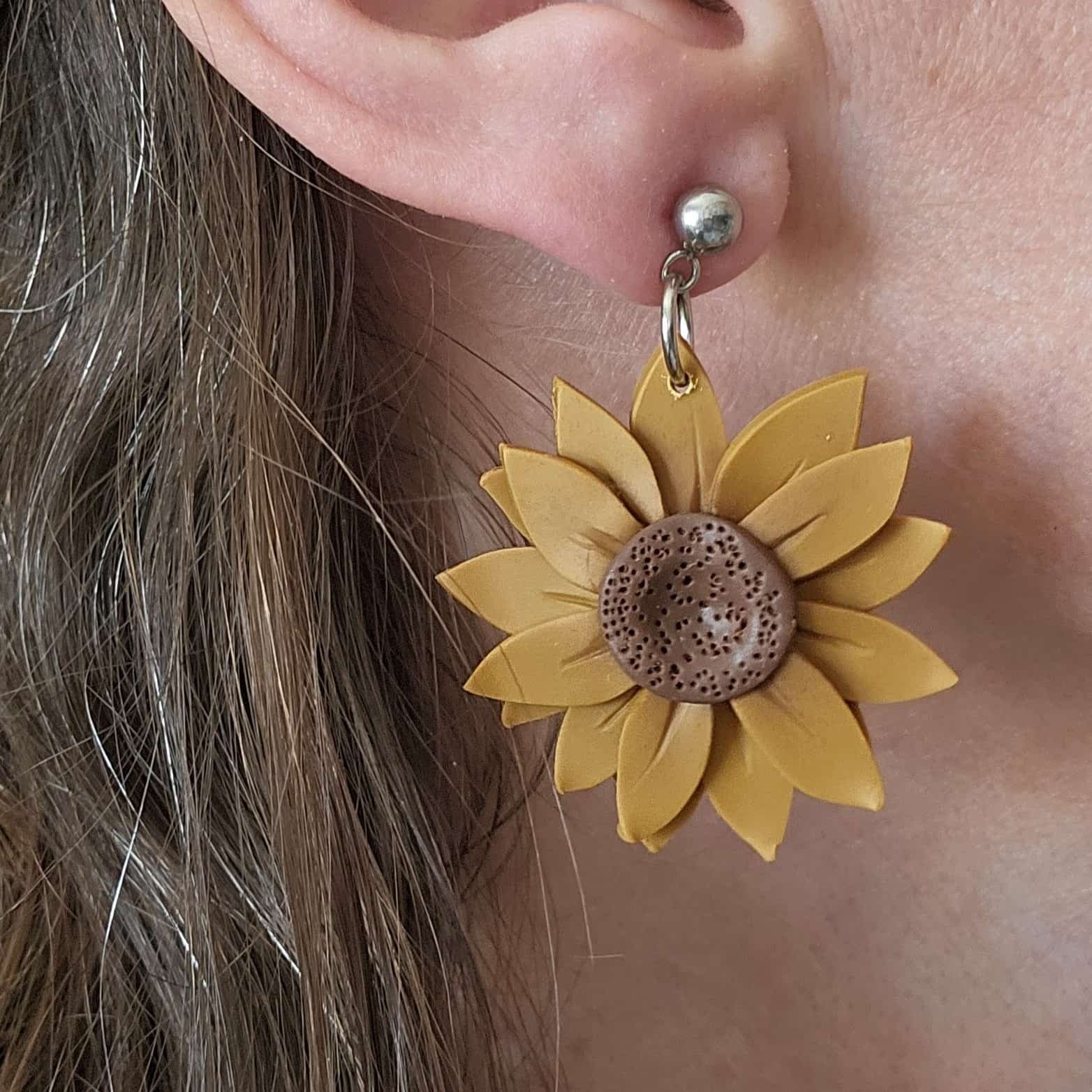 Preciosos y originales pendientes de girasol tamaño XL realizados a mano con arcilla polimérica. Sus enganches son pernos de acero inoxidable.