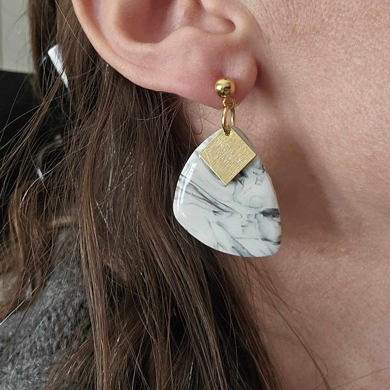 Pendientes marmolados de arcilla polimérica hechos a mano con color blanco y vetas negras cubiertos con una fina capa de resina, lo que aporta brillo y da ese toque tan único que tiene el mármol.