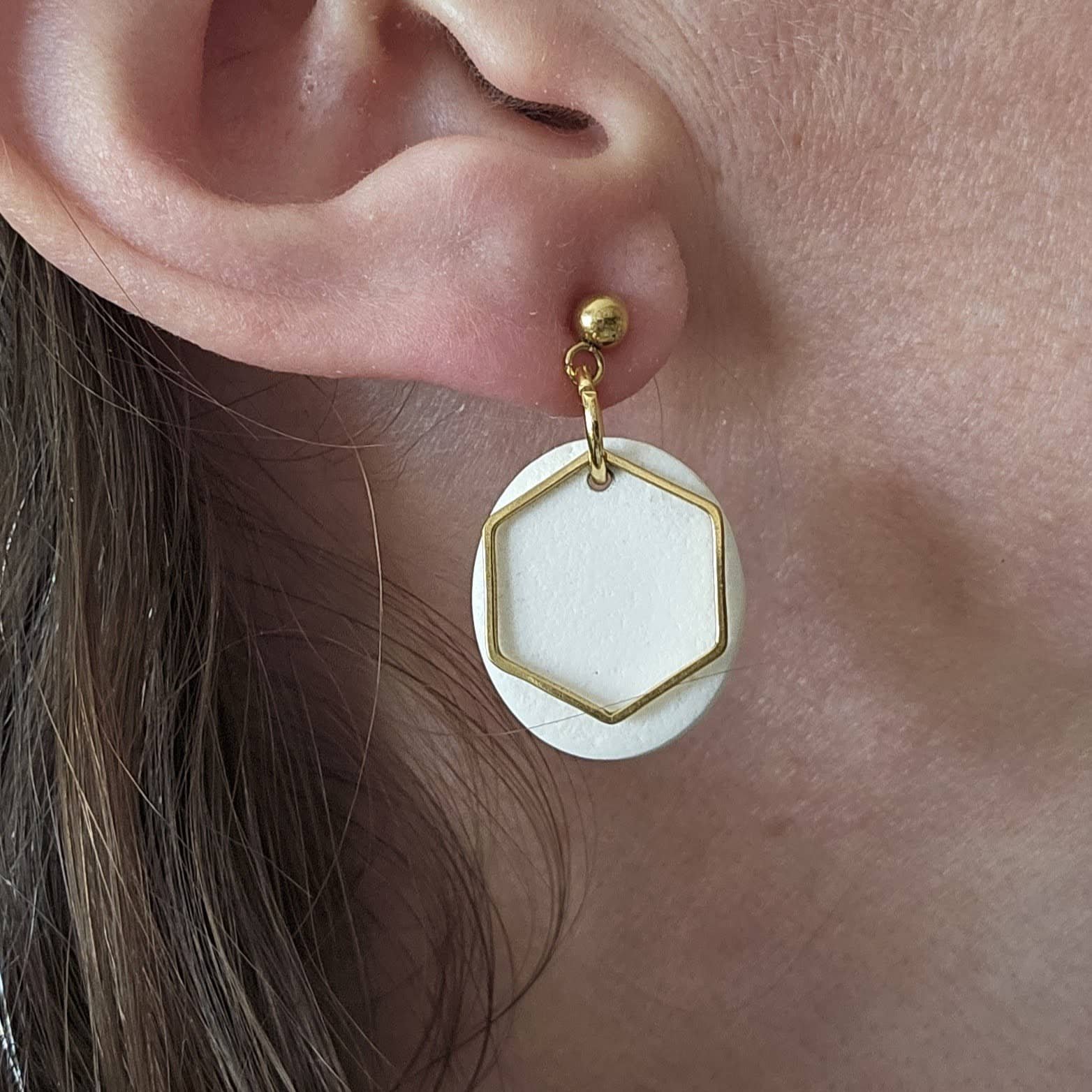 Cada pendiente está decorado con un delicado hexágono de latón dorado, que aporta un contraste sofisticado y moderno.
