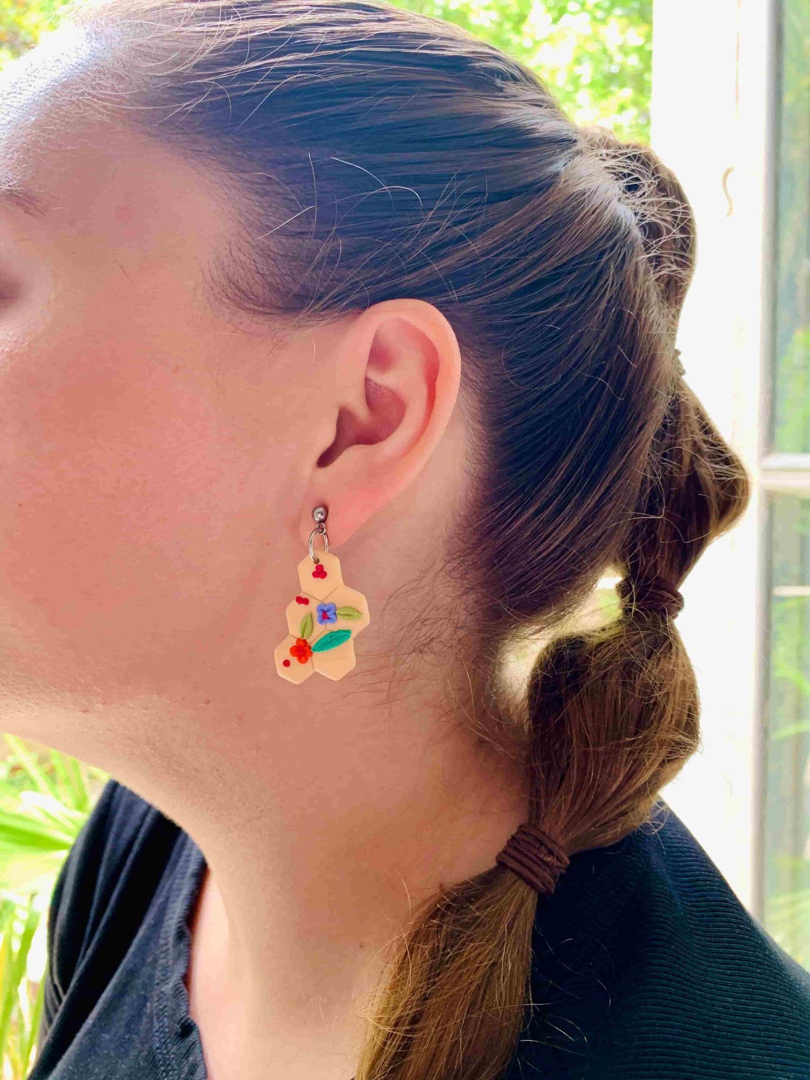 Su diseño geométrico, inspirado en los panales naturales, contrasta con la suavidad que aportan las flores. Este diseño es ligero, cómodo y montado sobre pernos de acero inoxidable hipoalergénico, perfectos para pieles sensibles.