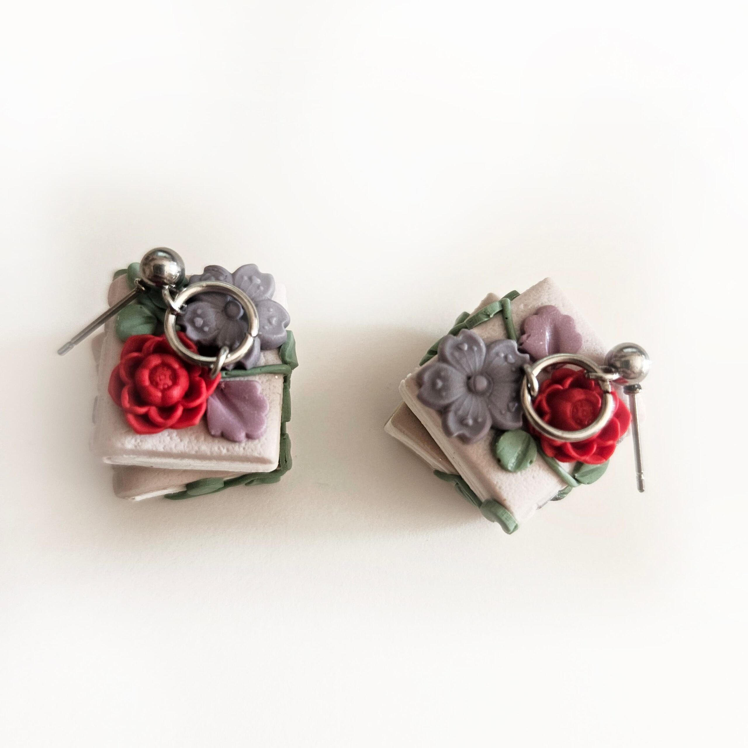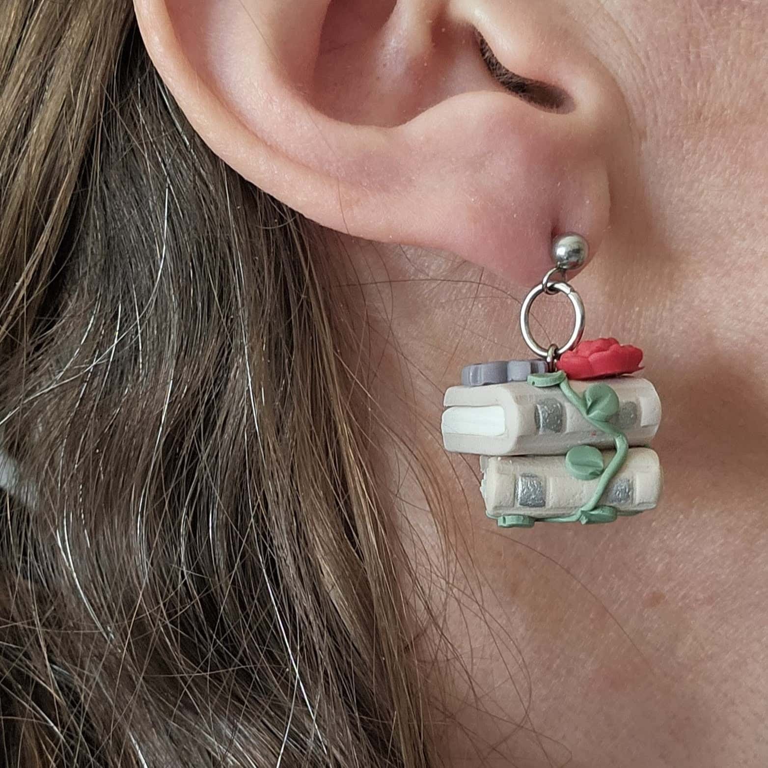 Pendientes Torre de Libros de la colección Nemus. Hechos a mano en arcilla polimérica, con forma de dos libros apilados y decorados con motivos vegetales. Ligeros, originales y con enganche de acero inoxidable.