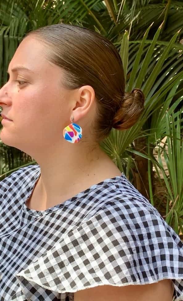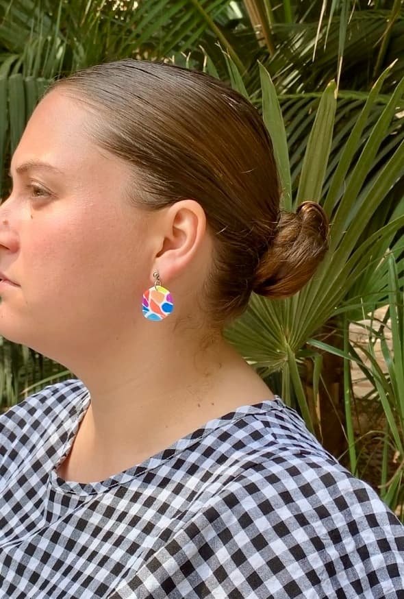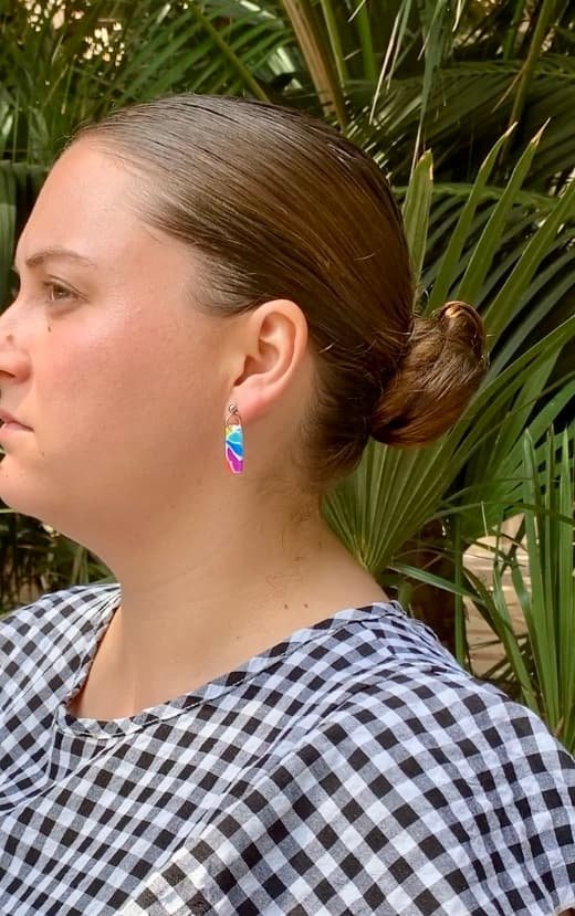 Divertidos pendientes de arcilla polimérica hechos artesanalmente con arcilla translúcida. La arcilla se ha teñido con vistosos colores que, al estar cubiertos de una capa de resina, enfatizan aún más sus vibrantes tonos y aportan un brillo especial.