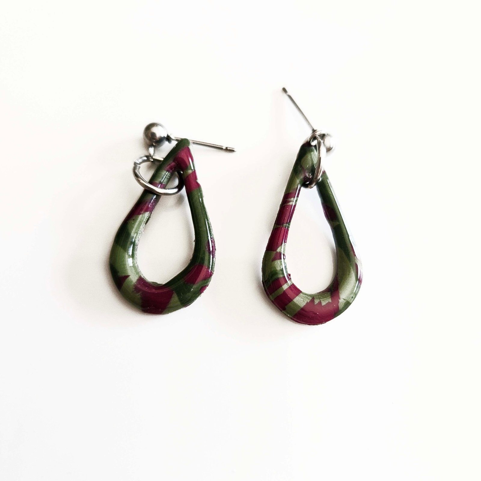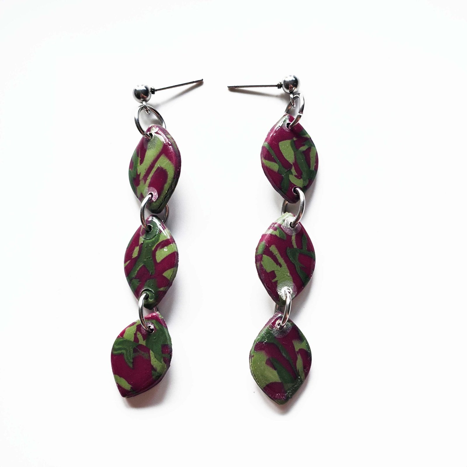 Pendientes artesanales en tonos verde selva, hechos a mano con arcilla polimérica. Ligeros, originales y únicos, inspirados en la naturaleza tropical. Un complemento elegante y fresco para looks diarios o especiales.